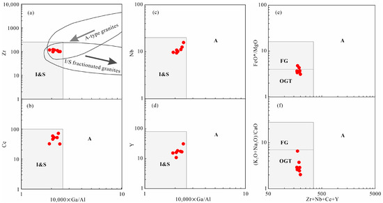 Discrimination diagrams for genetic type of the Ranwu pluton. (a) Zr vs. 10,000 Ga/Al diagram; (b) Ce vs. 10,000 Ga/Al diagram; (c) Nb vs. 10,000 Ga/Al diagram; (d) Y vs. 10,000 Ga/Al diagram; (e) FeO*/MgO vs. (Zr + Nb + Ce + Y) diagram; (f) (K2O + Na2O)/CaO vs. (Zr + Nb + Ce + Y) diagram; FG: fractionated granites; OGT: unfractionated I- and S-granites [32].