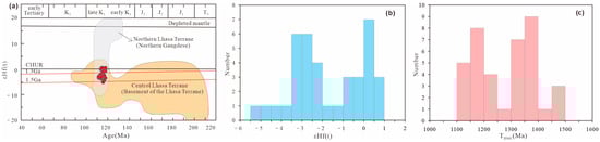 εHf(t) vs. crystallization age diagram (a), εHf(t) statistical histogram (b), and TDMC statistical histogram (c) of the Ranwu granites [49].