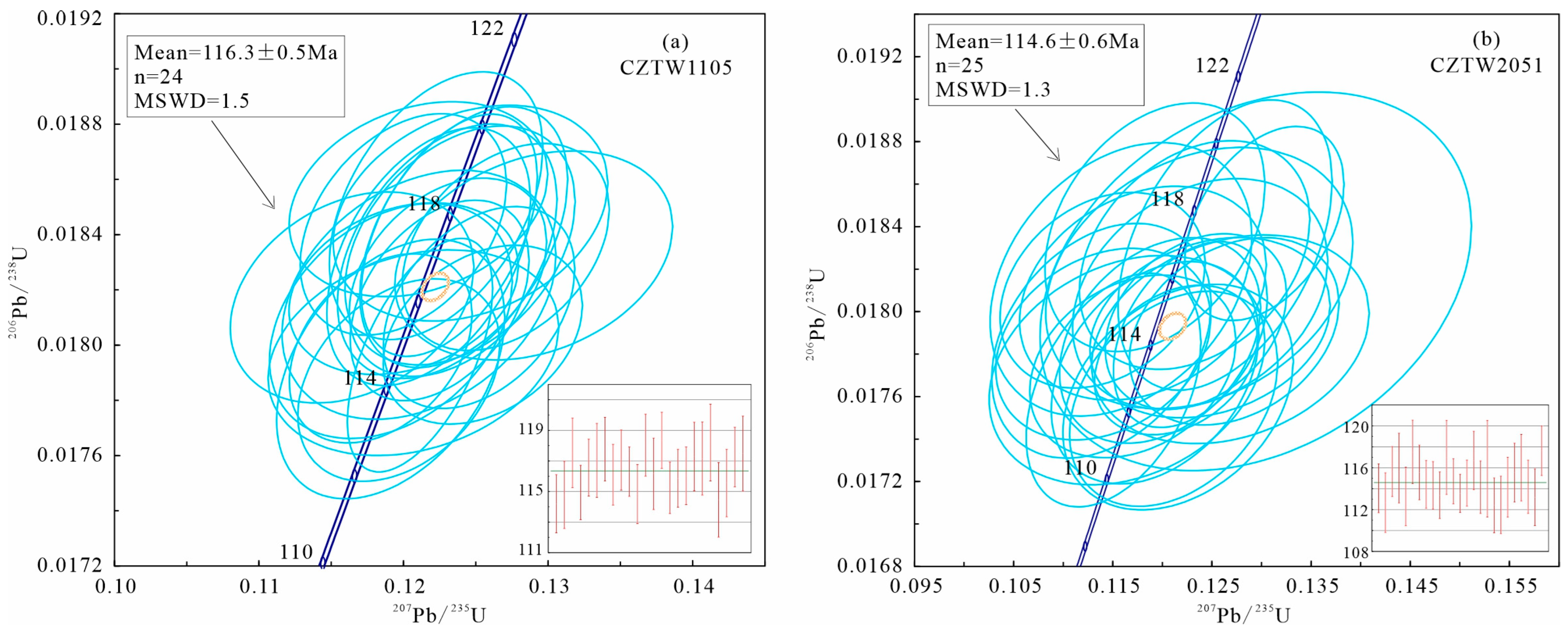- Wu, F.Y.; Jahn, B.M.; Wilder, S.A.; Lo, C.H.; Yui, T.F.; Lin, Q.; Ge, W.C.; Sun, D.Y. Highly fractionated I-type granites in NE China (I): Geochronology and petrogenesis. Lithos 2003, 66, 241–273. [Google Scholar] [CrossRef]