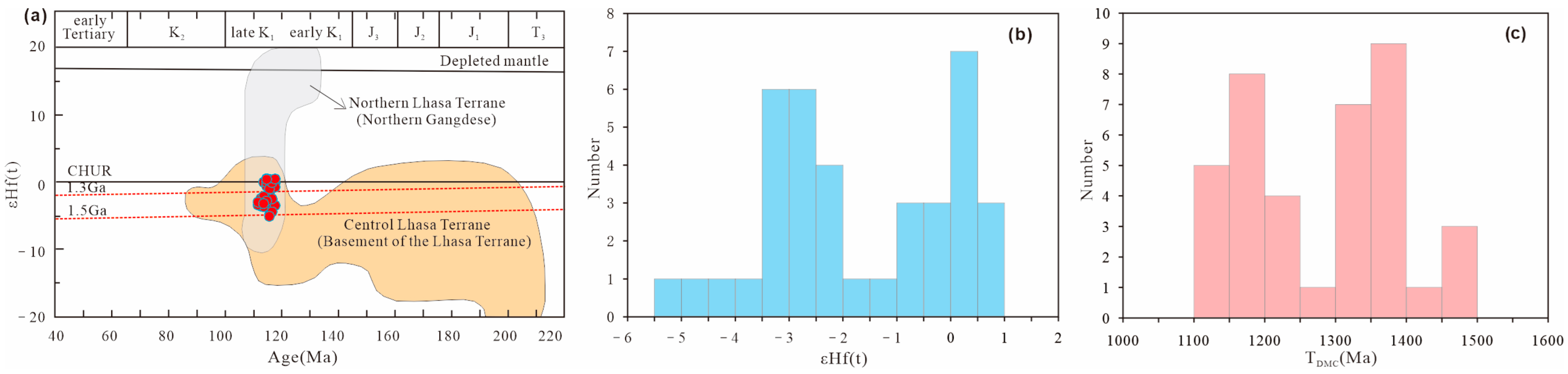 - Chiu, H.Y.; Chung, S.L.; Wu, F.Y.; Liu, D.Y.; Liang, Y.H.; Lin, I.J.; Iizuka, Y.; Xie, L.W.; Wang, Y.B.; Chu, M.F. Zircon U-Pb and Hf isotopic constraints from eastern Trans Himalayan batholiths on the precollisional magmatic and tectonic evolution in southern Tibet. Tectonophysics 2009, 477, 3–19. [Google Scholar] [CrossRef]