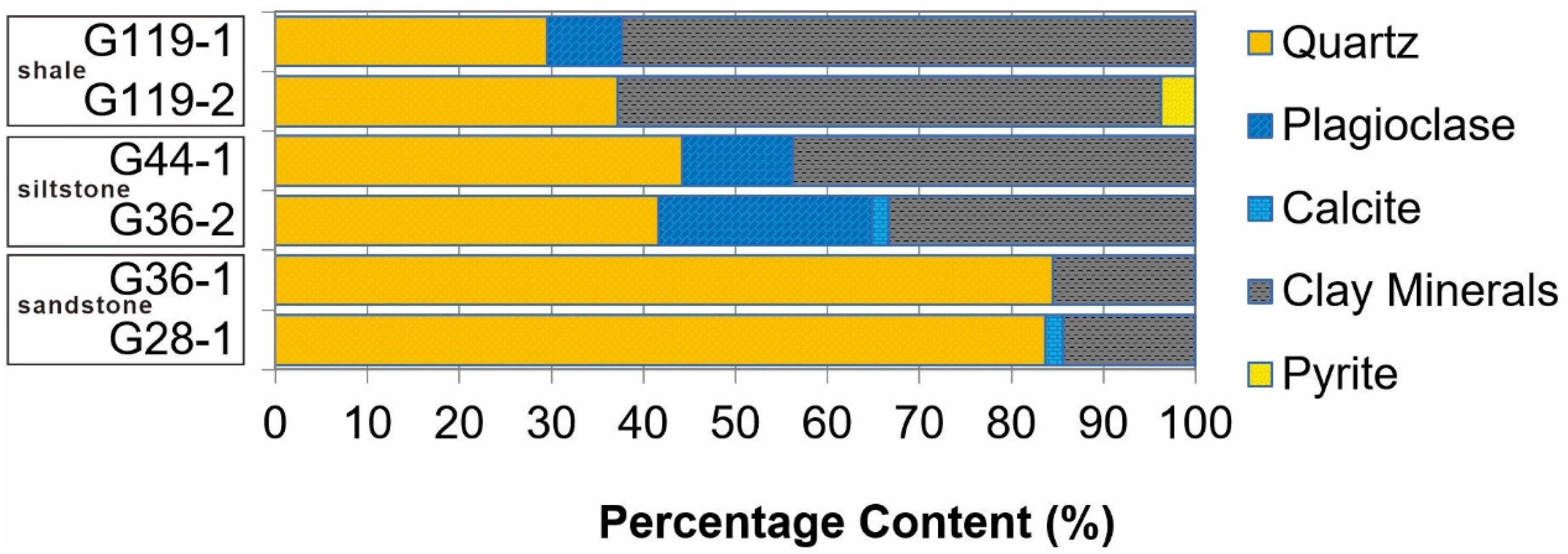 Figure 4), followed by siltstone (33.3%–43.76%) and sandstone (14.4%–15.5%). Sandstone has the highest quartz content (83.7%–84.5%), followed by siltstone (41.6%–44.26%) and shale (29.5%–37.2%). Shale samples also contain small amounts of pyrite.