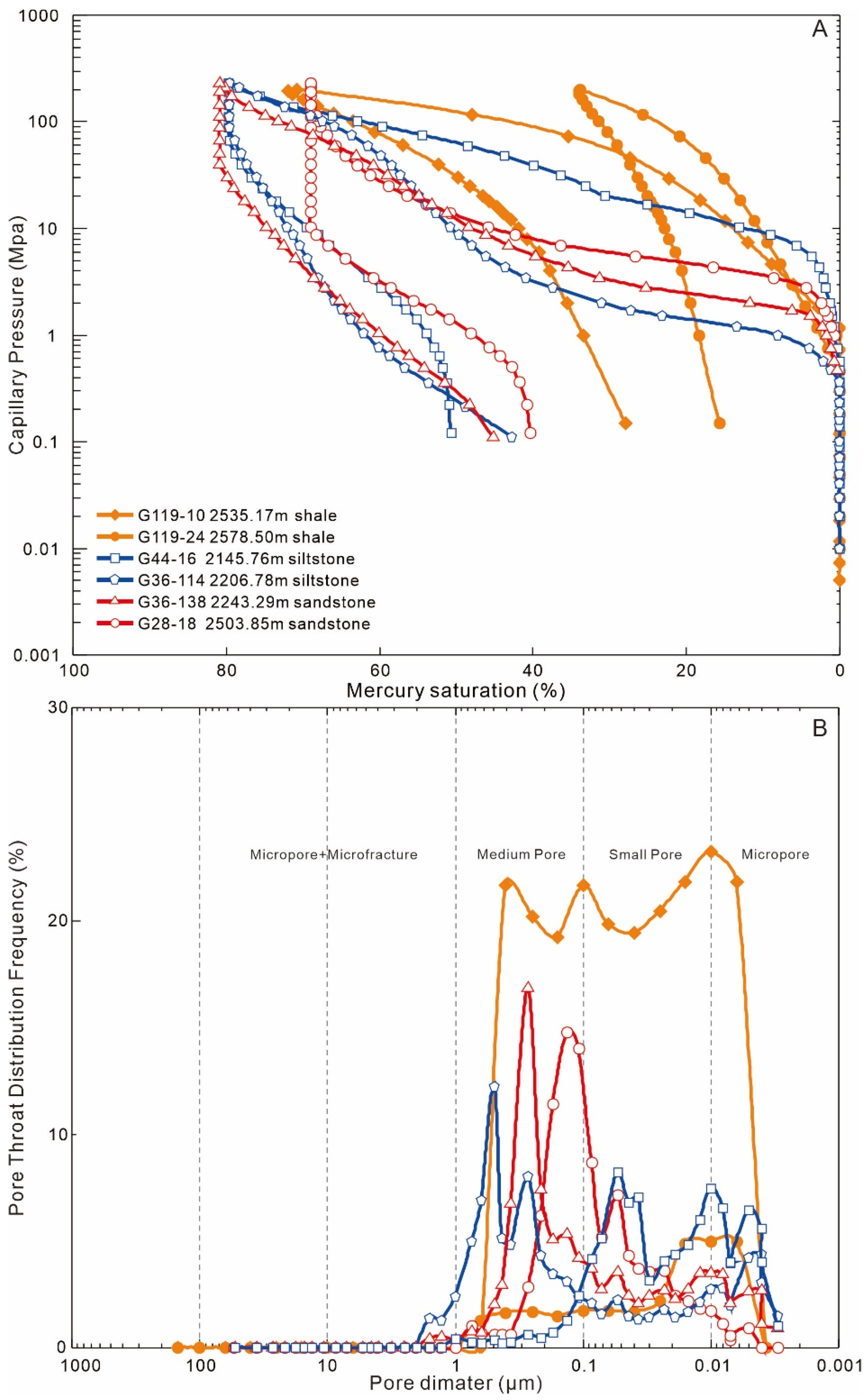 Figure 7). High-pressure mercury injection curves show that micron-scale pores are more developed in sandstone and siltstone than nano-scale pores, while shale exhibits a wider range of pore sizes, which may be heavily influenced by fractures (
