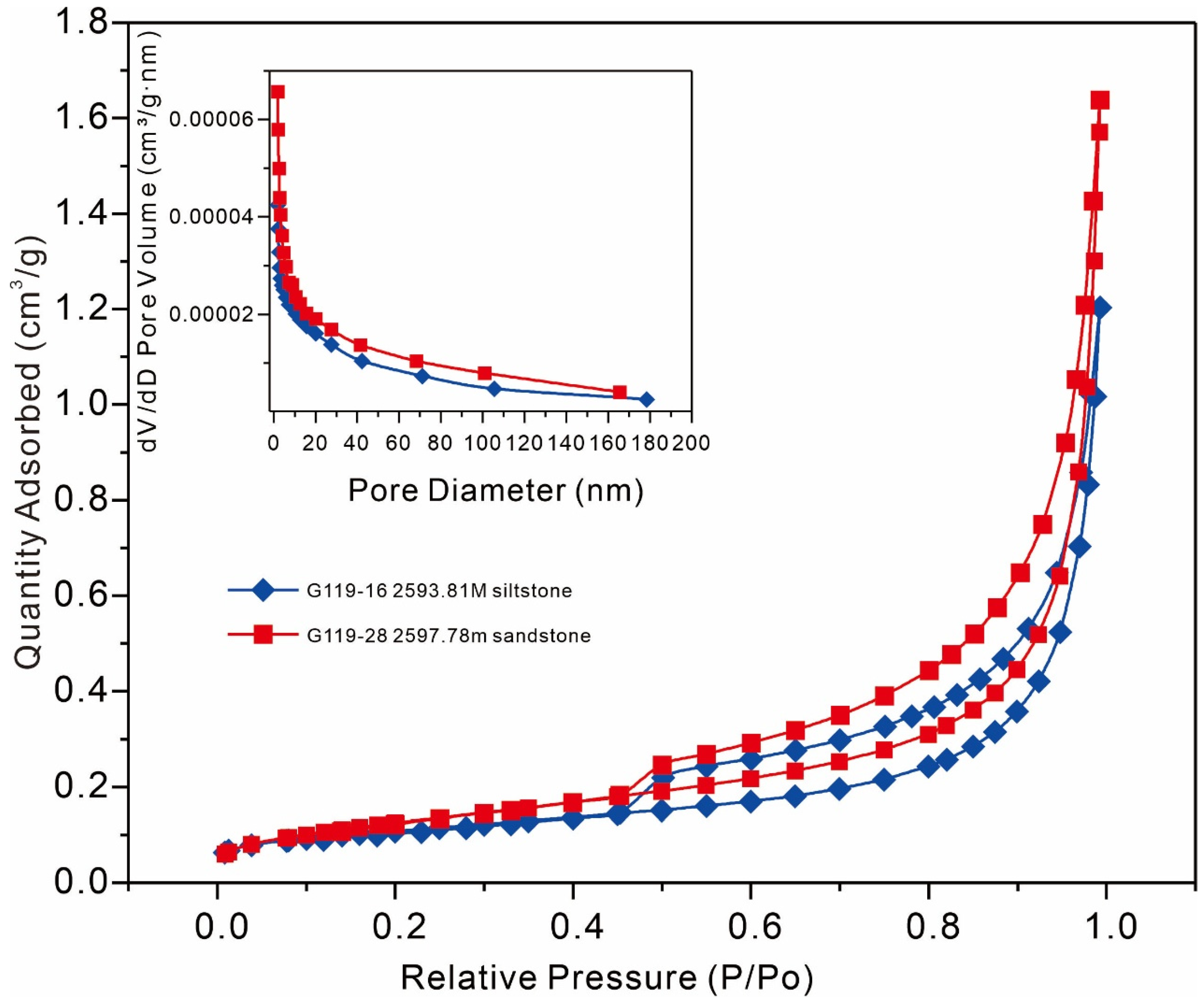 Figure 5). Low-temperature nitrogen adsorption reveals that siltstone has an H3-type hysteresis loop, with pore radii concentrated between 0 and 40 nm. NMR data also support this, suggesting that siltstone reservoirs are relatively tight and exhibit a complex pore structure. Notably, although sandstone reservoirs contain both micropores and mesopores, low-temperature nitrogen adsorption shows an H4-type hysteresis loop (