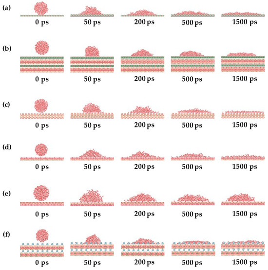 Figure 13 shows the changes in the water–decane–substrate system over time from 0 ps to 25,000 ps on different surfaces.