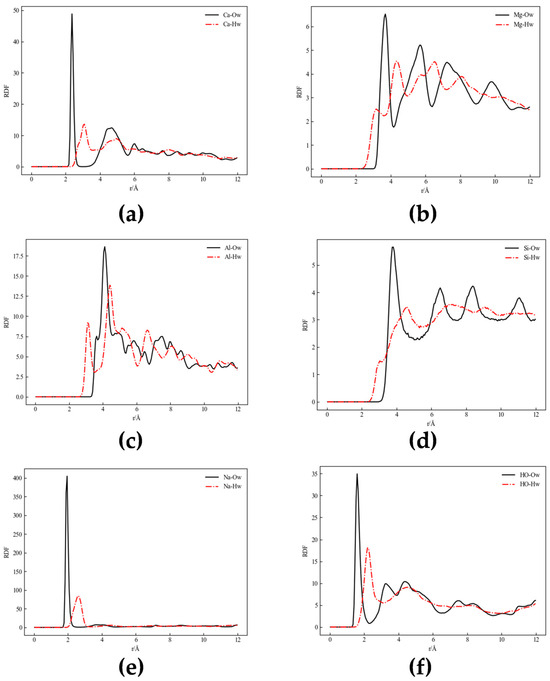 RDF curves between atoms in mineral structures and H2O molecules were calculated. The position of the first peak reflects the nearest neighbor distance between mineral surface atoms and water molecules, while its height and width reflect the strength of interaction and local ordering.