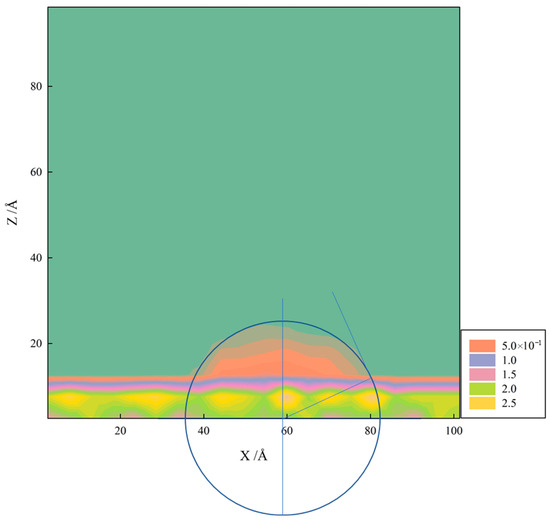 Second, the liquid–vapor interface was identified by locating the contour line corresponding to half the bulk liquid density. This contour line represents the equimolar dividing surface between the liquid and vapor phases. The substrate surface position was determined from the fixed mineral atomic coordinates.