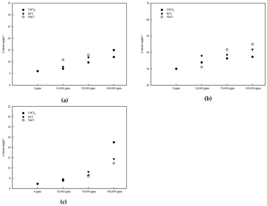 Variation in contact angles on different mineral surfaces under varying salinity conditions: (a) kaolinite aluminous surface, (b) kaolinite siliceous surface, and (c) quartz surface.