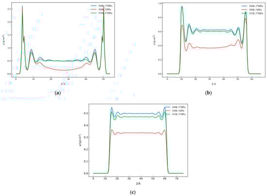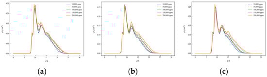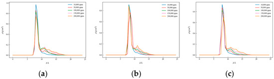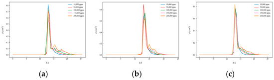 Figure 8, Figure 9 and Figure 10 present the one-dimensional density distribution curves for the kaolinite aluminum–oxygen surface, the kaolinite silicon–oxygen surface, and quartz at different salinities, with (a) representing CaCl2 solutions, (b) KCl solutions, and (c) NaCl solutions.