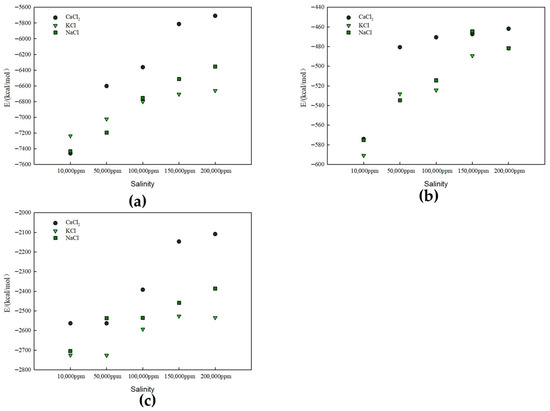 Figure 11 shows the interaction energy between the kaolinite aluminum–oxygen surface and different solutions: (a) CaCl2, (b) KCl, and (c) NaCl.