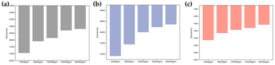 Figure 10 presents the interaction energy between solutions of different salinities and rock surfaces for (a) the kaolinite aluminum–oxygen surface, (b) the kaolinite silicon–oxygen surface, and (c) the quartz surface. The interaction energies were calculated using the end values of the simulation trajectories. The reference state for energy calculations was defined as the infinitely separated state of the interacting components, where the interaction energy equals zero. Negative interaction energy values indicate attractive forces between the components, with more negative values corresponding to stronger interactions.