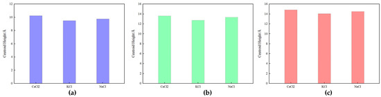 Figure 12 shows that at high salinity, different ions (CaCl2, KCl, NaCl) exhibited varying center-of-mass heights on different mineral surfaces. For the kaolinite aluminum–oxygen surface (Figure 12a), the effects of different ions on center-of-mass height were similar, with CaCl2 slightly higher than the other two salts, indicating stronger interaction between CaCl2 and the aluminum–oxygen surface leading to tighter ion adsorption. The center-of-mass height on the kaolinite silicon–oxygen surface (Figure 12b) was generally higher than on the aluminum–oxygen surface. The trend on quartz surface (Figure 12c) was similar to the silicon–oxygen surface. Comparing kaolinite and quartz surfaces, CaCl2 consistently showed higher center-of-mass heights across different rock surfaces, while KCl and NaCl typically resulted in lower center-of-mass heights, indicating stronger interaction of these ions with mineral surfaces.
