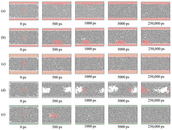 Variation in water–decane–substrate system over time on different surfaces: (a) kaolinite aluminous surface, (b) kaolinite siliceous surface, (c) quartz, (d) single-layer graphene, and (e) calcite.
