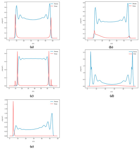 Figure 6 shows the one-dimensional density distribution of the kaolinite aluminum–oxygen surface in CaCl2 solutions with different salinities. For clearer comparison, regions with zero density on the X-axis were removed, as shown in Figure 7.