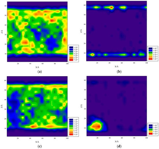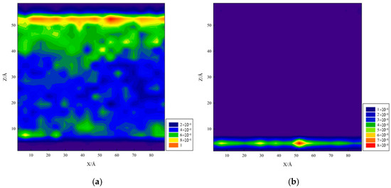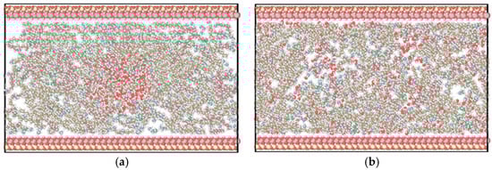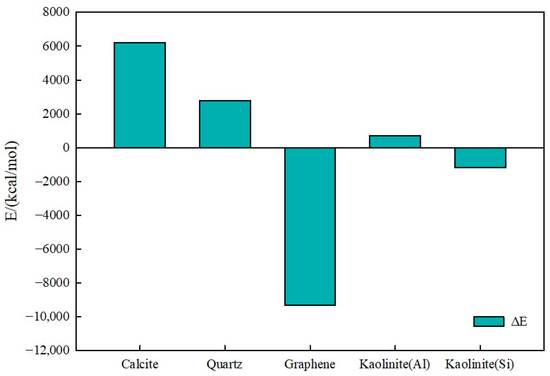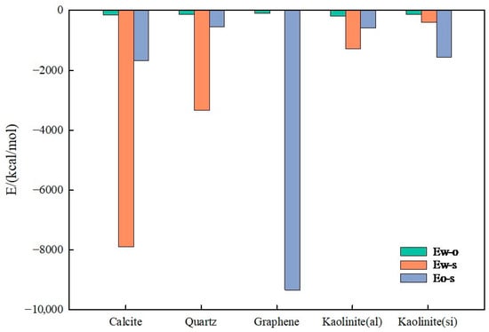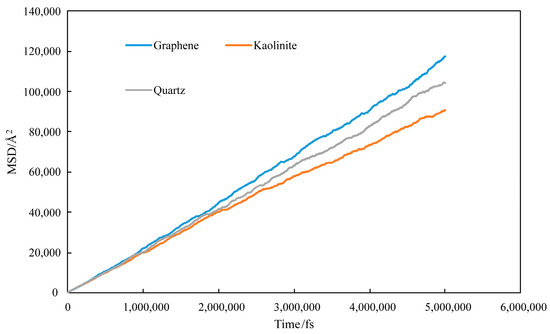 For the kaolinite aluminum–oxygen surface (Figure 13a), most water molecules adsorbed onto the kaolinite surface over time. For the kaolinite silicon–oxygen surface (Figure 13b), water molecules adsorbed on both upper and lower surfaces over time, mainly concentrated on the lower surface with lower adsorption degree than the aluminum–oxygen surface. For quartz (Figure 13c), water molecules completely adsorbed on both upper and lower quartz surfaces, indicating strong hydrophilicity. Graphene (Figure 13d) exhibited stronger oleophilicity, with decane molecules adsorbing on both upper and lower graphene layers while water molecules remained in the middle position. For the calcite surface, repeated simulations revealed randomness in adsorption surfaces, potentially occurring on either upper or lower layers, with water molecules completely adsorbing on calcite surfaces, demonstrating strong hydrophilicity.