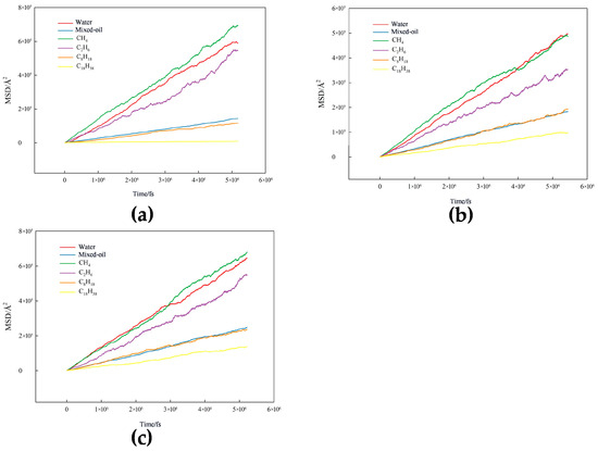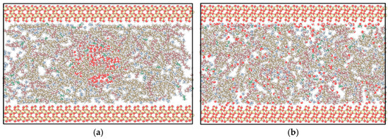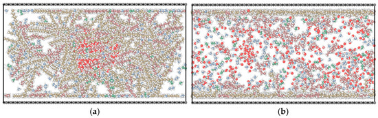 For the oil–water–substrate systems, the 50 Å dimension refers to the total height of the fluid layer (decane–water or mixed alkane–water) in the simulation box. The mineral substrate was positioned at the bottom of the simulation box with substrate atoms fixed to represent the rigid nature of mineral surfaces, while fluid molecules were free to move and equilibrate in all directions. The Berendsen thermostat employed a damping parameter of 100 fs. The temperature of 393 K and pressure of 37 MPa were selected to represent typical reservoir conditions for the Gulong shale oil field, where reservoir temperatures range from 376.85 to 413 K and formation pressures are approximately 28.6–37.5 MPa [34]. For the mixed alkane–water–substrate systems, pressure effects were investigated by conducting separate simulations at 1 MPa and 37 MPa to compare interfacial behavior under different pressure conditions.