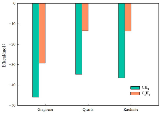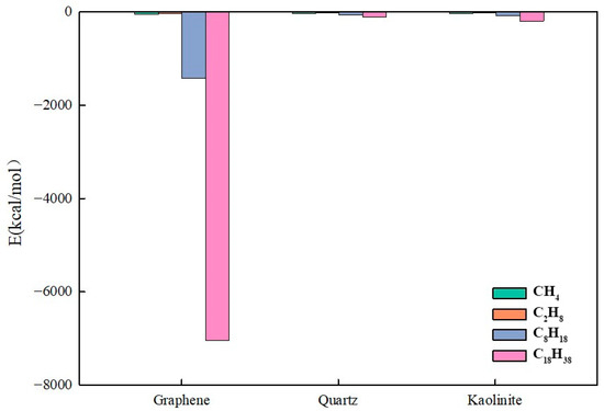 The mixed alkane system included methane (CH4), ethane (C2H6), n-octane (C8H18), and n-octadecane (C18H38). The substrates selected were graphene, kaolinite, and quartz. Simulations were conducted at reservoir temperature (393 K) and pressure (37 MPa). The mixed alkane–water layer system had a total height of 50 Å, and the model size was approximately 100 × 100 × 75 Å3. The initial model configuration is illustrated in Figure A4.