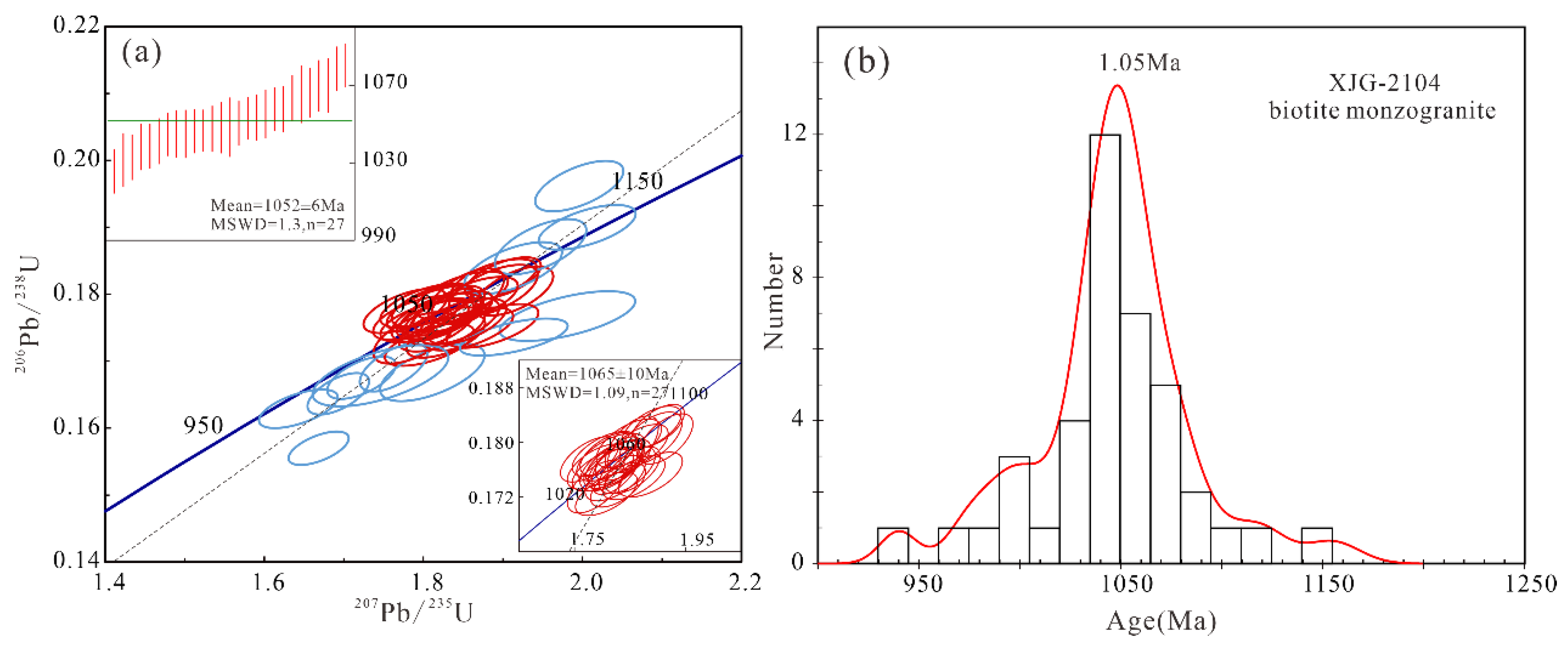 - Wang, Y.J.; Zhu, W.G.; Huang, H.Q.; Zhong, H.; Bai, Z.J.; Fan, H.P.; Yang, Y.J. Ca. 1.04 Ga hot Grenville granites in the western Yangtze Block, southwest China. Precambrian Res. 2019, 328, 217–234. [Google Scholar] [CrossRef]