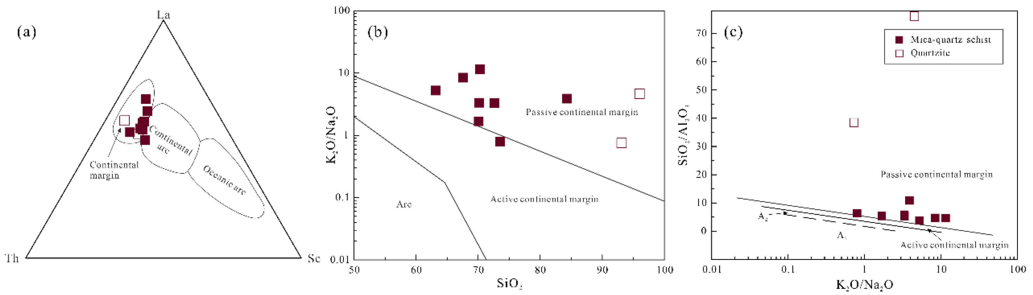 - Roser, B.P.; Korsch, R.J. Determination of tectonic setting of sandstone-mudstone suites using SiO2 content and K2O/Na2O ratio. J. Geol. 1986, 94, 635–650. [Google Scholar] [CrossRef]