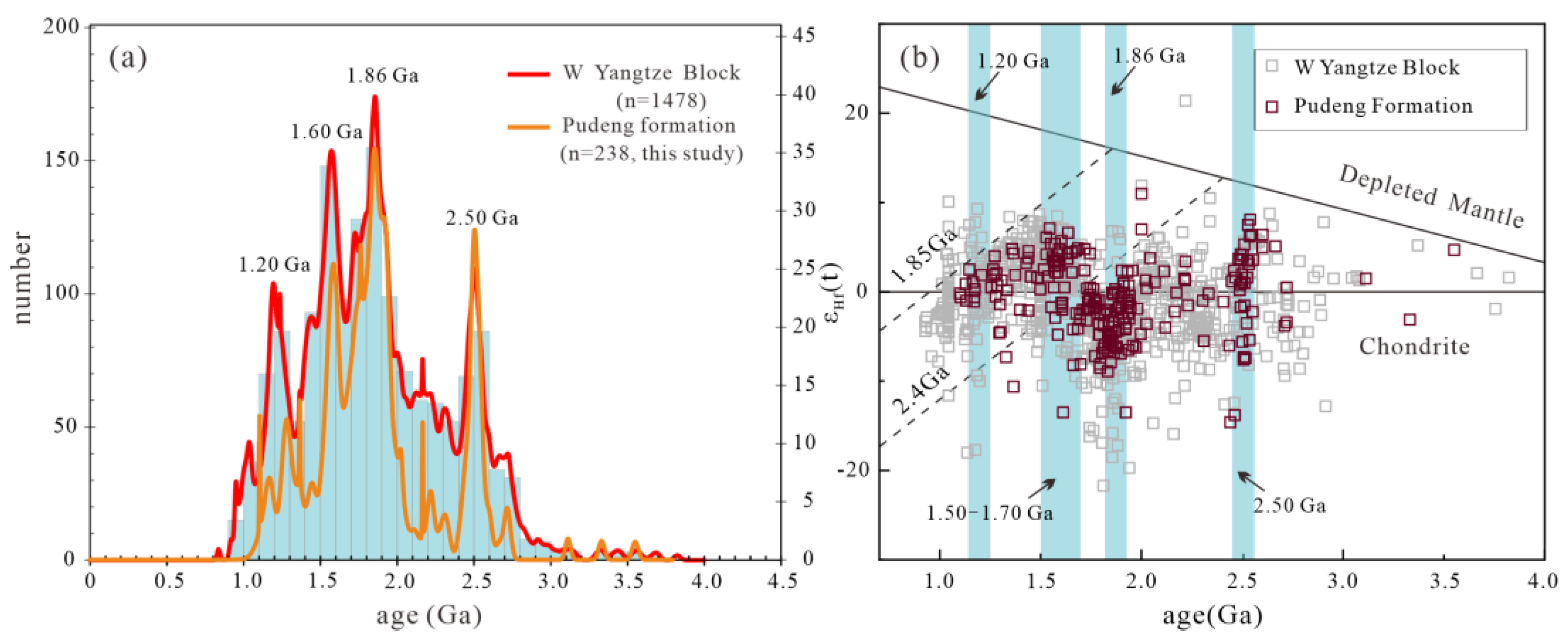 - Based on the ages and εHf(t) values of magmatic and detrital zircons from the western Yangtze Block, the tectonic setting of the block evolved from a subduction-related island arc at ~2.5 Ga, to an orogenic environment at ~1.86 Ga, and to an intracontinental extensional (rift) setting at ~1.6 Ga and ~1.2 Ga.