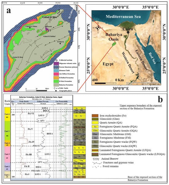 (a) A location map of the study area, including a geological map that shows the lithologic distribution and the precise location of Gebel El Dist. (b) The lithostratigraphic sequence includes an elevation log that displays grain density, porosity, and permeability measurements, along with the sampling locations. The figure also shows the following: Sample Number (S), Facies Association (FA), Lowstand Systems Tract (LST), Highstand Systems Tract (HST), Transgressive Systems Tract (TST), Surface of Unconformity (SU), Wave Ravinement Surface (WRS), Maximum Regression Surface (MRS), and Maximum Flooding Surface (MFS).