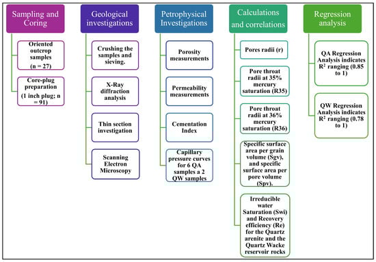 The complexity, limited data, and uncertainty associated with characterizing a poor-quality subsurface reservoir can be investigated by studying surface analogs. Such studies help establish a geological context and provide a basis for comparison, especially in areas where subsurface data is sparse [,]. Furthermore, the high costs of retrieving core plugs from deep reservoirs can be mitigated by using surface analogs to characterize reservoir heterogeneity []. Therefore, surface analog studies and subsurface reservoir characterization methods play complementary roles.