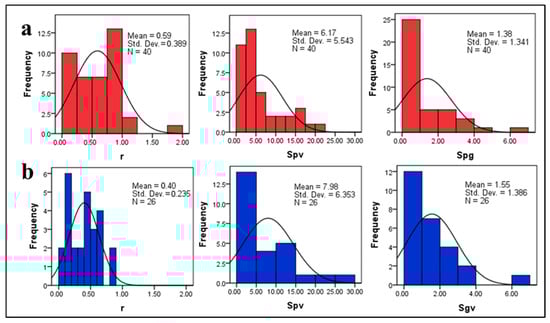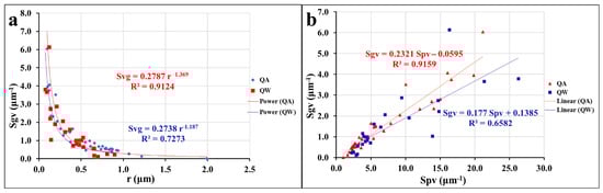 Statistical distributions of the pore radius (r) and the specific surface area per unit grain (Sgv), and per unit pore (Spv) are shown for (a) the QA facies; (b) the QW facies.