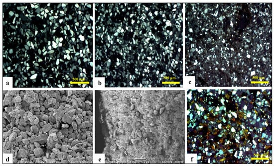 Mineralogical and textural features of the samples were examined through thin-section petrography (using end-trim plugs from cylindrical samples of 2.5 cm3), X-ray diffraction (XRD) of powdered samples (D8 Advance, Bruker, Billerica, MA, USA), and scanning electron microscopy (SEM) (Benchtop NeoscopeTM SEM, JOEL Solution for Innovation, Peabody, MA, USA). The classification and naming followed the sandstone scheme proposed by Pettijohn et al. [].