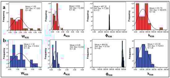The statistical distribution of the pore throat radii (WR35, AR35, ɸR36, and kR36) for (a) QA facies; (b) QW facies.