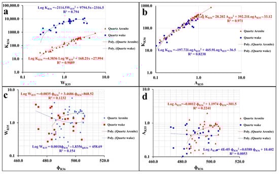 Comparison between apexes for the QA and the QW facies: (a) KR36 vs. WR35; (b) KR36 vs. AR35; (c) WR35 vs. ɸR36; (d) AR35 vs. ɸR36.