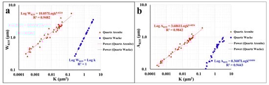 The correlation between Sgv and pore radius (r) yields an R2 value of 0.91 for QA and 0.72 for QW (Figure 5a). The higher correlation coefficient for QA is attributed to its low concentration of formation fines (Figure 4a,d), as well as the effects of better sorting (σI) and mean grain size (Mz). QA grains are relatively better sorted and more subrounded, whereas QW grains are poorly sorted with a higher proportion of subangular grains (Figure 4). A second correlation between Sgv and Spv shows R2 values of 0.91 and 0.65 for QA and QW, respectively (Figure 5b). The higher R2 value for QA can be explained by the same factors noted for the previous correlation. Furthermore, the depositional environment plays a role; QA is characterized by a Lowstand Systems Tract (LST), while QW is found in either LST or Highstand Systems Tract (HST) settings.