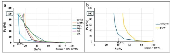 The pressure generated when two immiscible fluids (wetting and non-wetting) flow simultaneously in a narrow, tortuous channel or tube is known as capillary pressure (Pc) [,]. This property is important for understanding multiphase flow regimes in a reservoir or an aquifer. Capillary forces in reservoirs arise from the combined effects of surface and interfacial tensions, pore size, and the wetting affinity of each fluid for the rock. When measured, these properties help determine important factors such as the irreducible wetting phase saturation (Swi), the residual non-wetting phase saturation (Sr), and the microscopic recovery efficiency (Re) for each reservoir rock type. To investigate the Pc for both facies, six QA and two QW core plugs were saturated. The maximum saturation of the QA facies reached 80 to 90% maximum saturation (Sbmax). The QW facies reaches 100% saturation as it has lower cementation than the QA facies. Figure 9 shows that at the maximum capillary pressure (Pc) applied, no more brine could be expelled from the core samples; the remaining water inside the sample is the irreducible water (Swi or Sbr), which cannot be expelled even after increasing the capillary pressure to more than 100 psi. The figure also shows that the QA facies have a mean irreducible water saturation (Swi) of 12.5% (Figure 9a), while the QW due to its clay content retains more brine which increases its mean Swi to 40.5% at the same (Pc) (Figure 9b). Consequently, due to the difference in the Swi between both facies, the mean microscopic recovery efficiency (Re) is higher in the QA facies than in the QW facies. The mean Re was calculated to be equal to 83.1% for QA and 59.5% for QW (Table S1), reflecting a better-quality reservoir for the QA facies.