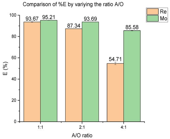 Figure 1 illustrates the extraction performance of a 5% v/v concentration of the extractant Alamine 336 in the diluent [Omim][Tf2N] in PLS-Re for Mo, Re, Cu, and Fe, assessed at varying (A/O) phase ratios (1:1, 2:1, and 4:1). with the aim of reducing the amount of solvent needed for the SX. At an (A/O) ratio of 4:1, the extraction performances for Mo (VI) and Re (VII) were relatively low, suggesting that increased A/O ratios negatively impact the extraction performances of both metals. The high interaction between the extractant and diluent is the reason for the decreased extraction percentages of all metal species [35]. When the A/O ratio was reduced to 2:1, a noticeable improvement was observed for Re extraction, which increased from 87.34% to higher values, while Mo extraction remained fairly stable at around 93.6%. Further decreasing the A/O ratio to 1:1 resulted in the highest extraction performances for both Re (93.7%) and Mo (95.2%). This trend demonstrates that decreasing the A/O ratio enhances extraction performance by providing a higher concentration of extractant relative to the metal ions, facilitating better phase interaction and mass transfer. Nevertheless, this phenomenon has led to enhanced selectivity for Mo-Re, particularly when employing low extractant concentrations in [Omim][Tf2N]] [28]. This pattern aligns with the results reported by Zhang-Fang et al. [3], who reported that Re extraction performance decreased markedly from 97% at A/O ratios of 1:2–1:1 to 76.7% at 2:1, due to the limited loading capacity of the extractant and changes in activity coefficients at elevated aqueous-to-organic ratios. Similarly, in this study, maintaining an A/O ratio of 1:1 allowed high extraction of both Re and Mo, while higher A/O ratios disturbed the phase balance and reduced extraction performance, especially for Mo. Similarly, Adavodi R et al. [44] found that increasing the A/O ratio reduced Mo, Co, and Ni extraction due to limited extractant capacity and poorer phase mixing.
