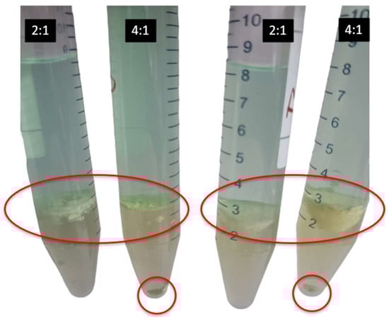 Third-phase formation observed during Re (VII)–Mo (VI) solvent extraction at O/A ratios of 2:1 and 4:1. Circled areas indicate the separated dense phase and visible aggregates.