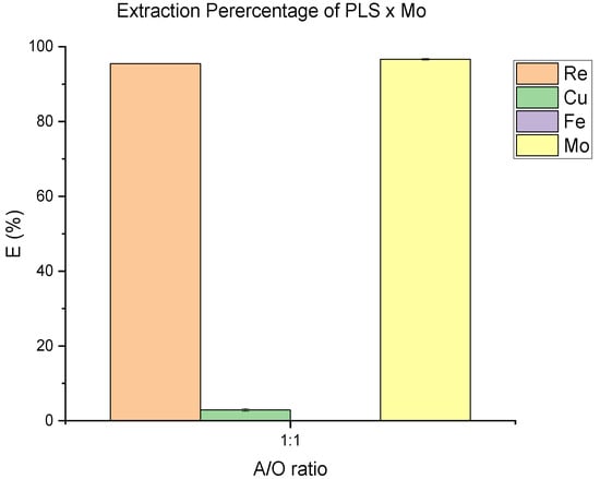 The extractant percentage of each metal extracted using 5% (v/v) Alamine 336 in [Omim][Tf2N] in the PLS-Mo system is shown in Figure 3. Mo (VI) was almost completely extracted (98%), while Re (VII) reached 95% extraction. Similarly to previous findings [28], an increase in the extraction percentages of Mo (VI) and Re (VII) was observed due to strong extractant–diluent interactions between [TOMA][D2EHP] and [Omim][Tf2N] compared to kerosene; our system, using Alamine 336 with [Omim][Tf2N], exhibited significantly better performance. Although the Mo–Re selectivity (1.37) in Table 6 was moderate due to their similar oxyanion chemistry, the system still achieved a very high selectivity of Mo over Cu and Fe. Comparable behavior was also observed by Zhang et al. [53], who employed quaternary ammonium salt-based hydrophobic DES systems to selectively extract Mo (VI) from a spent-catalyst solution containing Al (III) and Co (II). They reported very high distribution ratios for Mo (D ≈ 1000) and strong selectivity over base metals. Overall, these results validate the ionic solvent as a suitable system for the selective extraction of Mo and Re for industry, particularly in solutions where copper and iron are present in large excess and must be effectively excluded.