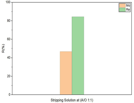 Figure 4 illustrates the re-extraction performance of Mo and Re from the loaded Alamine 336/[Omim][Tf2N] solvent when using approximately 1M ammonium carbonate as a stripping agent, which demonstrates its effectiveness in IL-based systems. At an A/O ratio of 1:1, Re was re-extracted more effectively (84.4%) than Mo (46.8%). Similarly, the prior study [16], with [Aliquate336][Cynax272] in ammonium carbonate, achieved 100% Re recovery with negligible Mo, indicating that although both systems confirm the performance of ammonium carbonate for selective Re recovery. The [Omim][Tf2N]-based solvent enhances overall stripping but promotes some Mo co-stripping and recoveries above 100%, likely due to mass balance or re-dissolution effects. These findings align well with earlier studies indicating that ammonium carbonate serves as the most effective stripping agent for IL systems, achieving approximately 90% re-extraction of Mo in a single stage when using [Omim][Tf2N] as the diluent together with D2EHPA [35]. The performance of ammonium carbonate is due to its basic nature, as higher pH levels cause the breakdown of organometallic complexes and lead to the liberation of [MoO2 (HSO4)4]2− ions into the aqueous phase. Previous studies have effectively extracted the metal ion from the organic phase by utilizing ammonium carbonate solutions [54,55]. In this study, the behavior was further examined in the Alamine 336/[Omim][Tf2N] system, revealing that ReO4− was preferentially extracted compared to MoO4+. This underscores the capability of ammonium carbonate to facilitate the selective separation of Re from Mo within IL-based solvent extraction systems. Finally, these results provide insights for the downstream purification of Re and Mo, in which adding more equilibrium stages in a countercurrent stripping operation could achieve very high Mo and Re purities in ammonium carbonate.