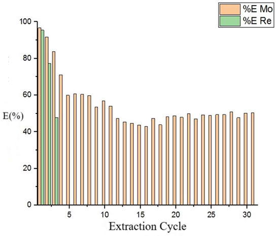 The performance of the IL in cyclic extraction for Mo and Re in PLS-Re is illustrated in Figure 5. In the initial cycle, extraction rates were nearly complete, with Mo at 99% and Re at 96%. However, the extraction performance significantly declined in the following cycles, falling to 70% for Mo and below 50% for Re after five cycles. After more than 10 cycles, the system reached a constant performance, with Mo extraction remaining at 50% and Re at 40%. This decline is primarily attributed to incomplete metal removal during the stripping process, which leaves the IL partially loaded with Mo and Re. As a result, in subsequent cycles, the extraction performance decreases due to the increased activity coefficient of the metal complexes in the partially loaded solvent. The sharper decline in Re compared to Mo indicates a stronger binding affinity of the solvent for Mo species relative to perrhenate, which aligns with the stripping results where Re was more readily displaced from the organic phase. This trend aligns with the study [56], where Mo leaching and extraction remained high (>98%) but gradually decreased due to competition from other metal cations, while Re concentration in the raffinate increased to 42.13 mg/L over seven cycles, highlighting effective Re enrichment. Both studies demonstrate that while Mo maintains relatively strong retention, Re is more easily displaced or enriched, confirming the selectivity of the extraction and cyclic enrichment strategies.