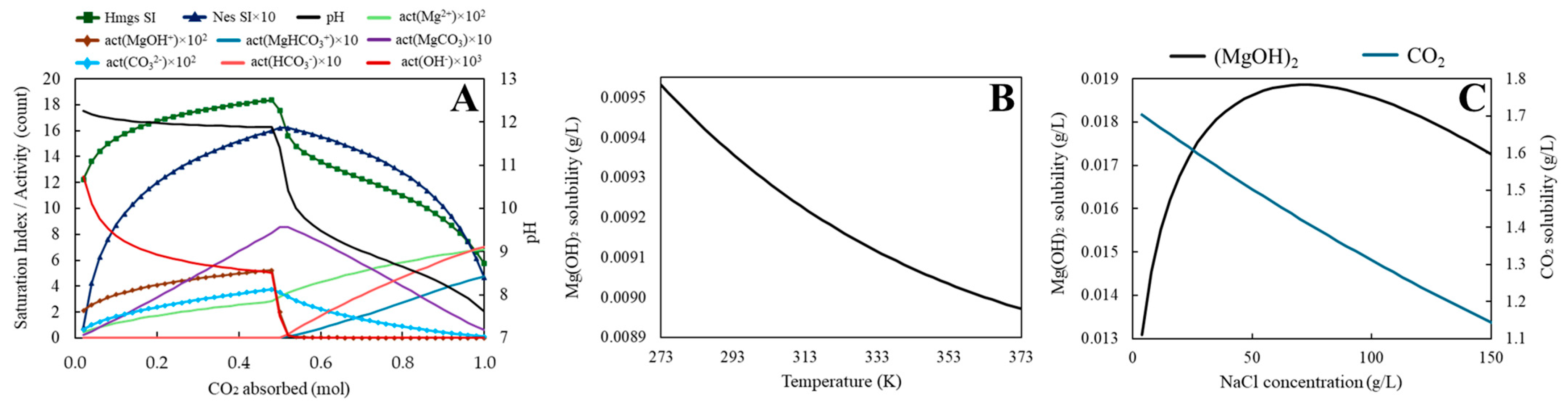 3.1.1. Mg(OH)2 Aqueous Carbonation Equilibrium