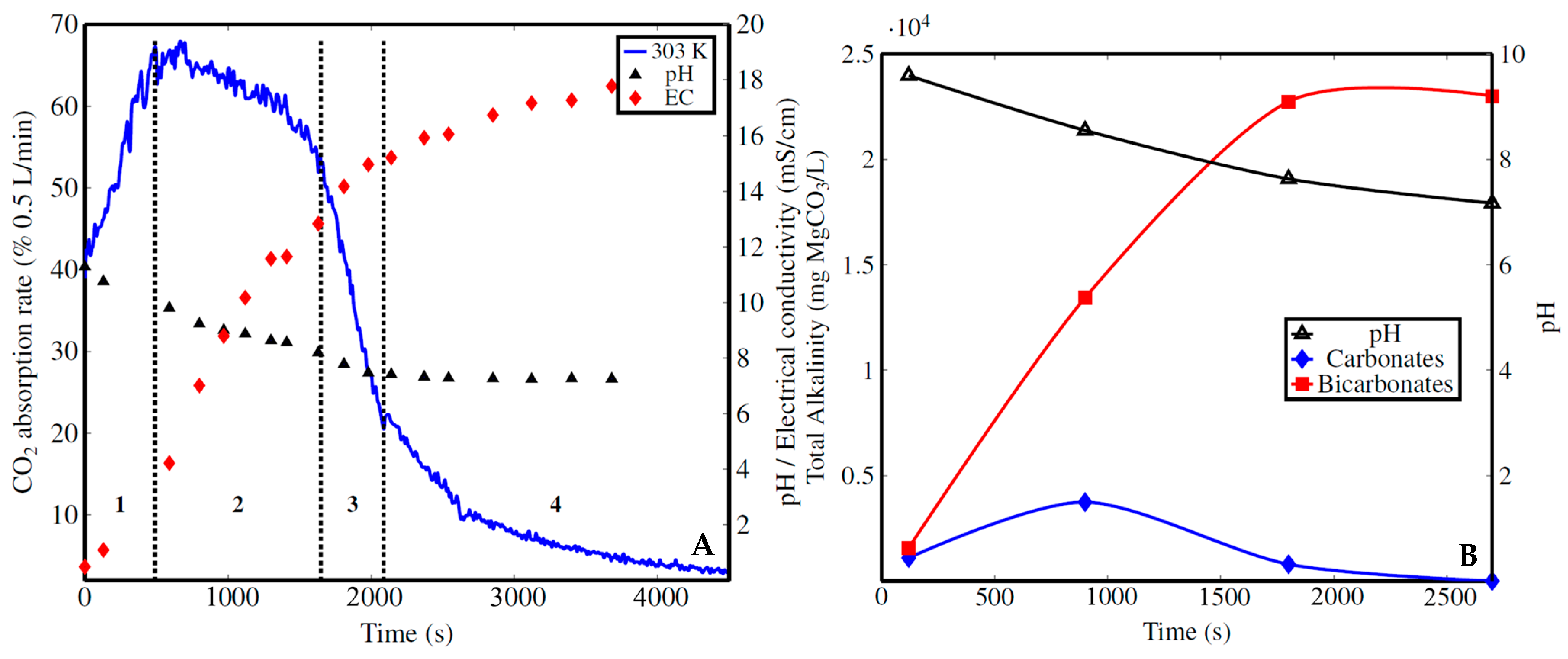 | Effect of Temperature | Stabilizes Cal, increases carbonation kinetics up to ≈343 K and CO2 uptake | Precipitation of less hydrated and more stable carbonate phases, steep decrease in carbonation kinetics and CO2 uptake with temperature due to lower CO2 solubility and bicarbonate formation. However, Mg-silicate carbonation is dissolution-controlled and requires high temperatures. | This study; [47,83] |