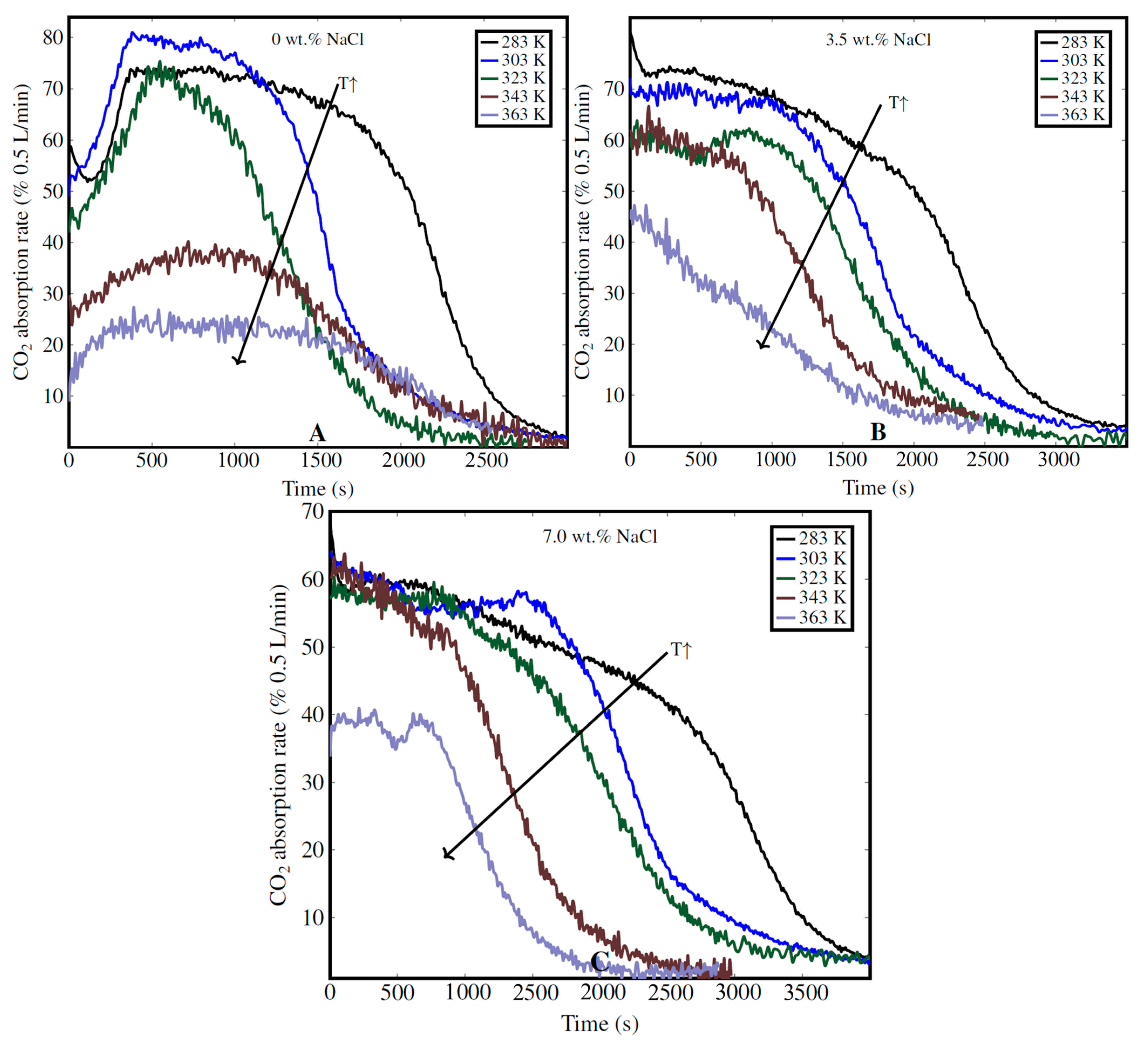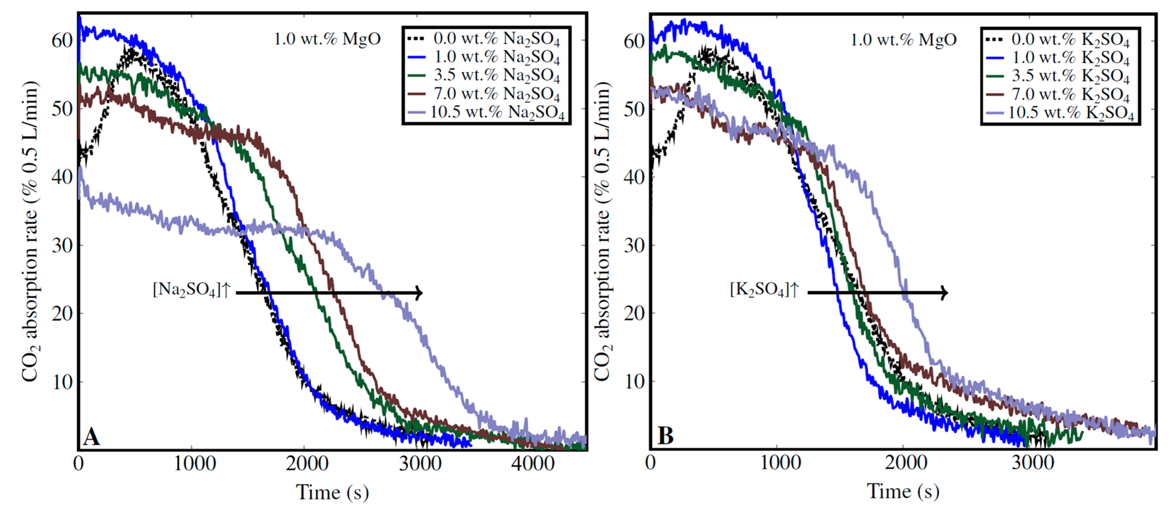 | Sulfate impurities | Among the tested salts (NaCl, KCl, K2SO4, Na2SO4), Na2SO4 was the most efficient, enhancing the CO2 absorption rate by up to 75%. K2SO4 was also highly effective at low concentrations (<2 wt.%) | Slightly enhance the absorption rate at low concentrations (<2 wt.%) but reduce it at higher levels, with no significant impact on the CO2 uptake | [47,86]; this study; [87] |