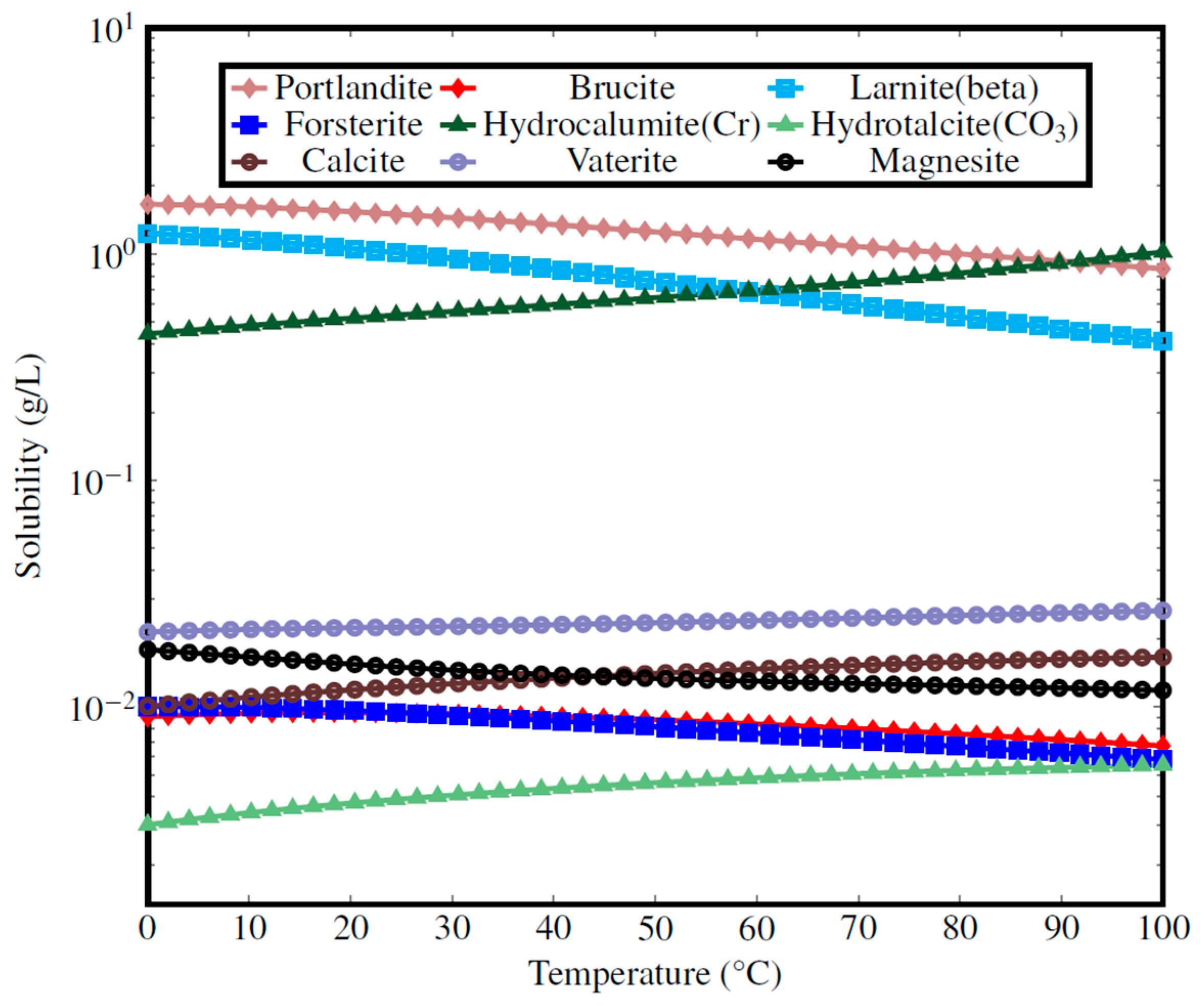 | Hmgs formation | Log K° = − 37.08; ∆fG° = –5866.6; ∆fH° = −6514.9 | Stable at pH > 9.5, common in long-term carbonation | [7,66,67] | |