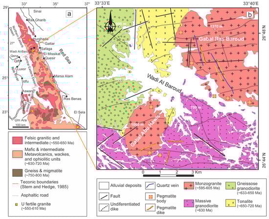 (a) Geological setting of the Eastern Desert of Egypt, with the study area at Wadi Al-Baroud indicated; (b) Local geology of the Wadi Al-Baroud area, highlighting the outcrop patterns of older and younger granitoids, as well as numerous pegmatite intrusions (Modified from Fawzy et al. []).