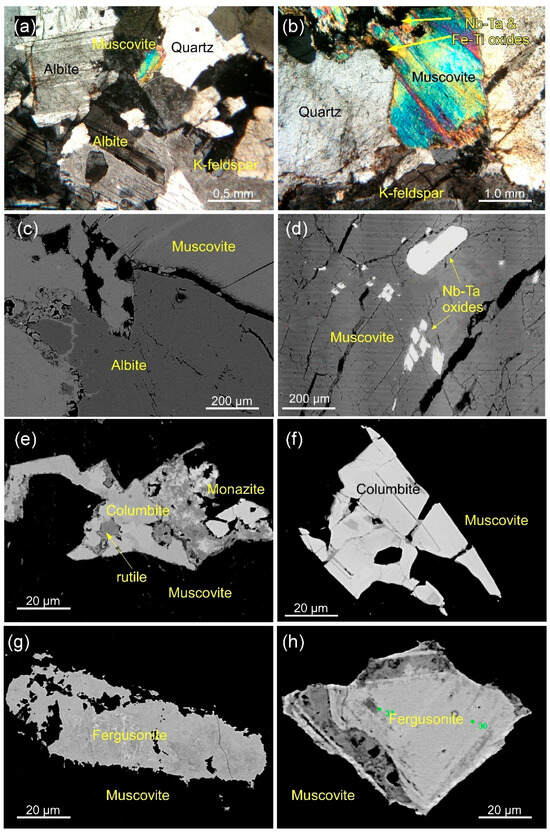 (a,b) Photomicrographs showing the main mineral phases in granites and pegmatites. Representative BSE images showing textures from the granite (c,e,g) and pegmatites (d,f,h). (c) Muscovite and albite intergrowth with micron-scale bright HFSE oxide inclusions along grain boundaries and fractures; (d) Muscovite hosting fracture-controlled Nb–Ta oxide pods aligned along fluid pathways; (e) Columbite with irregular embayed margins, rutile exsolution blebs, and monazite-(Ce) reaction rims recording fluid-induced re-equilibration; (f) Tabular columbite with straight edges and internal oscillatory zoning, indicating primary magmatic growth; (g) Fergusonite-(Y) occurring as elongate grains with mottled zoning and skeletal margins, reflecting partial replacement and chemical heterogeneity; (h) Fergusonite-(Y) with porous alteration rims and bright micron-scale inclusions, recording intense fluid–rock interaction and localized HREE enrichment.
