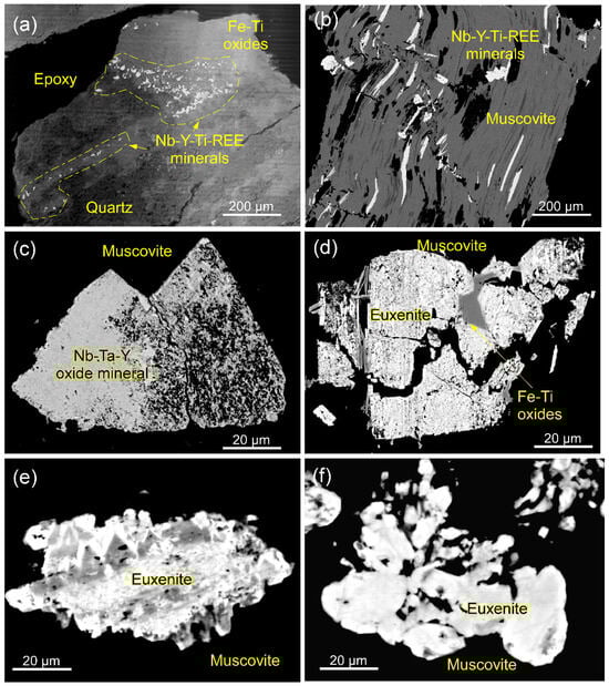 Pegmatitic textures (Figure 3a,b) reveal abundant Nb–Y–Ti–REE oxides distributed within muscovite-rich domains and concentrated along micro-fractures and foliations. These oxides occur as disseminated inclusions, crack-fill textures, and replacement fronts, suggesting that structural focusing and late-stage fluid percolation played a decisive role in rare-metal concentration. Y-rich Nb-Ta oxides (Figure 3c) exhibit a distinct mottled BSE texture with alternating bright and dark sectors, indicative of subtle magmatic compositional fluctuations and oscillatory growth. Euxenite-Y (Figure 3d,e) occurs as fractured, porous grains with abundant voids and irregular crack networks. These brecciated textures are attributed to metamictization due to in situ U–Th decay, followed by fluid-induced leaching and partial chemical redistribution. Euxenite (Figure 3f) displays irregular margins, patchy zoning, and pervasive internal corrosion, features characteristic of metamict breakdown and fluid-mediated alteration. These secondary textures attest to a complex post-magmatic history involving structural damage, leaching, and re-precipitation of HFSE phases under fluid-rich conditions.
