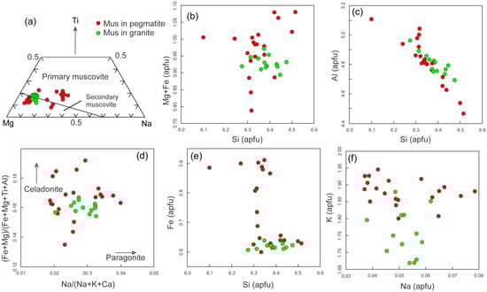 (a) Ternary Mg–Ti–Na diagram for muscovite of the Wadi Al-Baroud area, Eastern Desert of Egypt, discriminating between primary and secondary muscovite (after Miller et al. []); (b) Chemical composition diagram of the muscovite from Wadi Al-Baroud rare metal pegmatite and granite, Eastern Desert of Egypt (after Clarke []); (c) Si vs. Mg+Fe diagram; (d) Si vs. Al diagram; (e) Si vs. Fe diagram; (f) Na vs. K diagram.