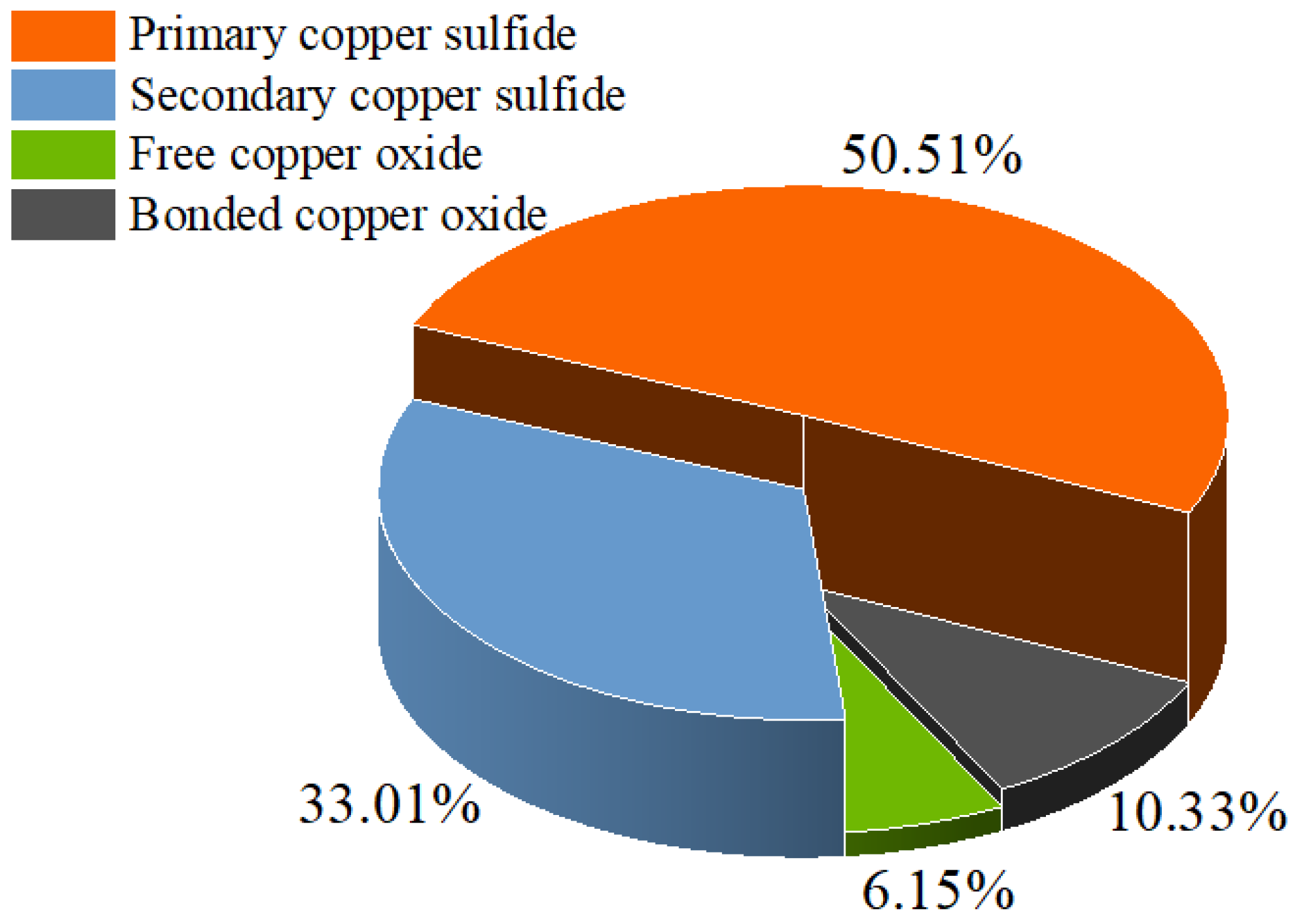 The ore samples in this test were taken from Honghe Prefecture, Yunnan Province. Samples were taken from different mines according to the site mining conditions, and representative ore blocks were mixed and selected for process mineralogy research. The remaining ore samples were crushed to −2 mm in a closed circuit by a jaw crusher and a high-pressure roll crusher, and then reduced and mixed as test ore samples for chemical multi-element analysis, copper chemical image analysis, and flotation experimental research.