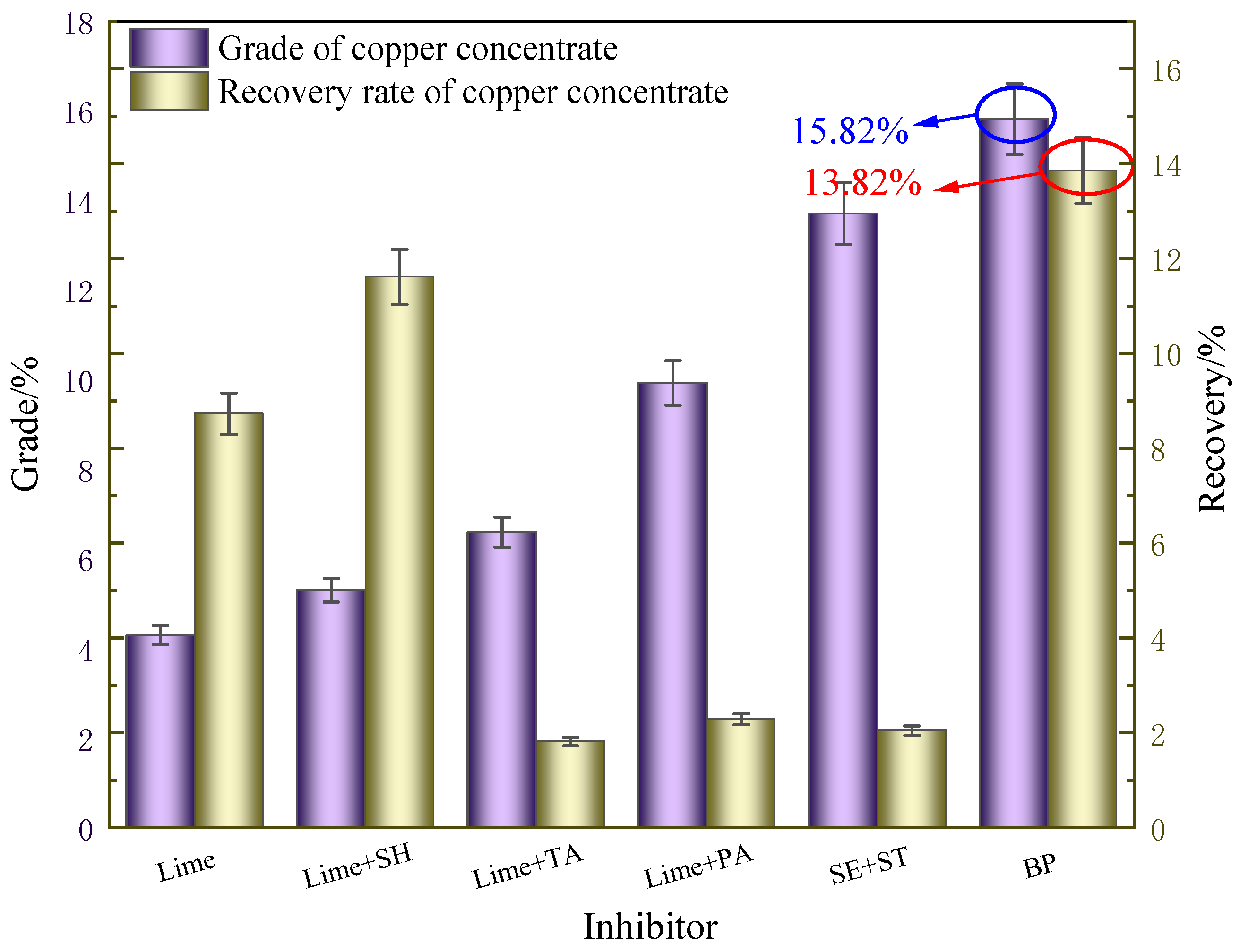 21]. However, the extensive use of lime as an inhibitor for copper–sulfur separation can cause pipe blockage, high flotation froth viscosity, and the severe loss of rare metals [