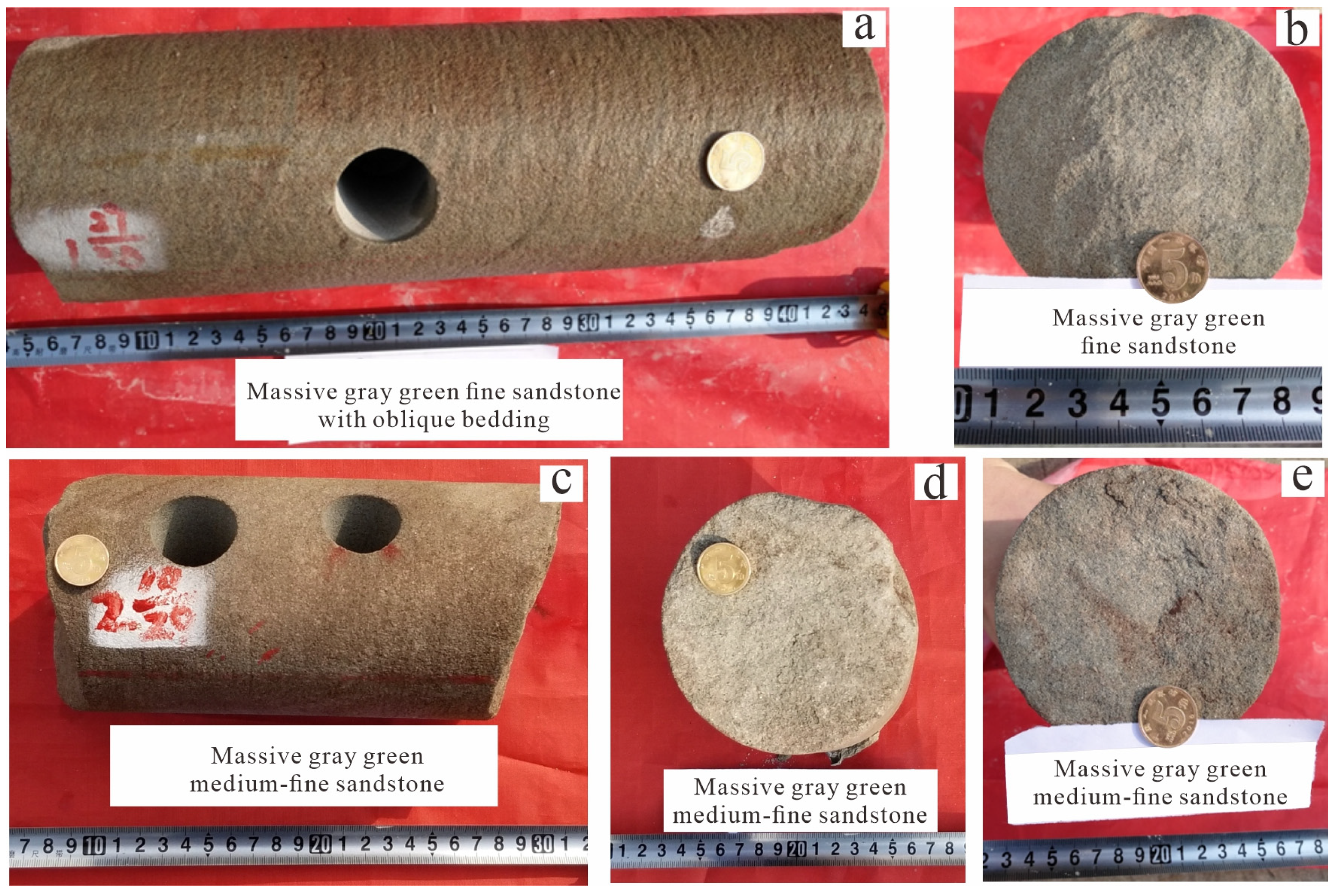 Figure 2. Macro-characteristics of the core samples from the study area. (a) 1537.33–1537.6 m, well Z2, massive gray-green fine sandstone, cross-bedding; (b) 1627.27 m, well Z4, massive gray-green fine sandstone; (c) 2644.52–2644.82 m and (d) 2644.82 m, well Z5, massive gray-green medium-fine sandstone; (e) 2595.62 m, well Z6, massive gray-green medium-fine sandstone, section of Figure 1c.