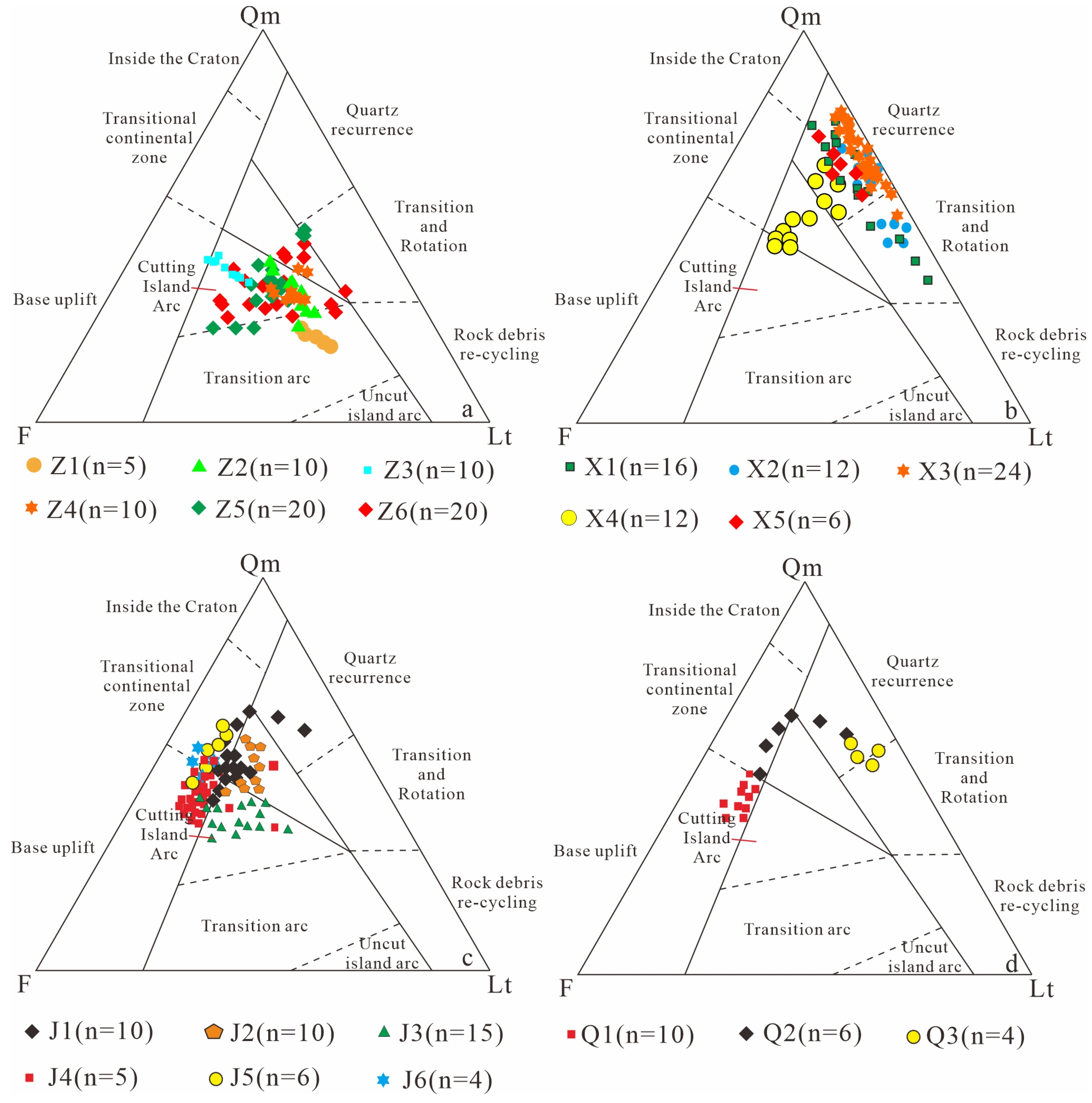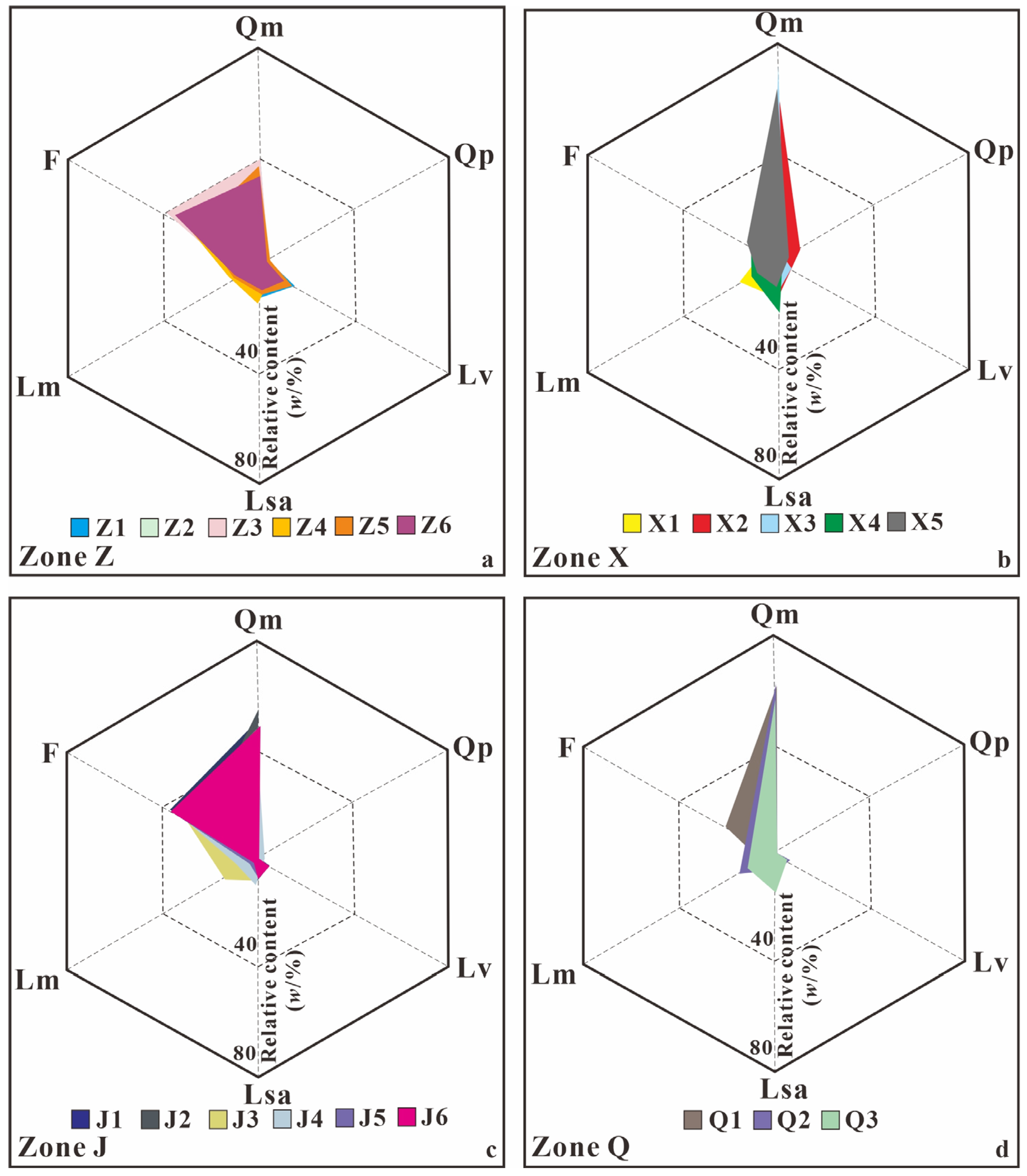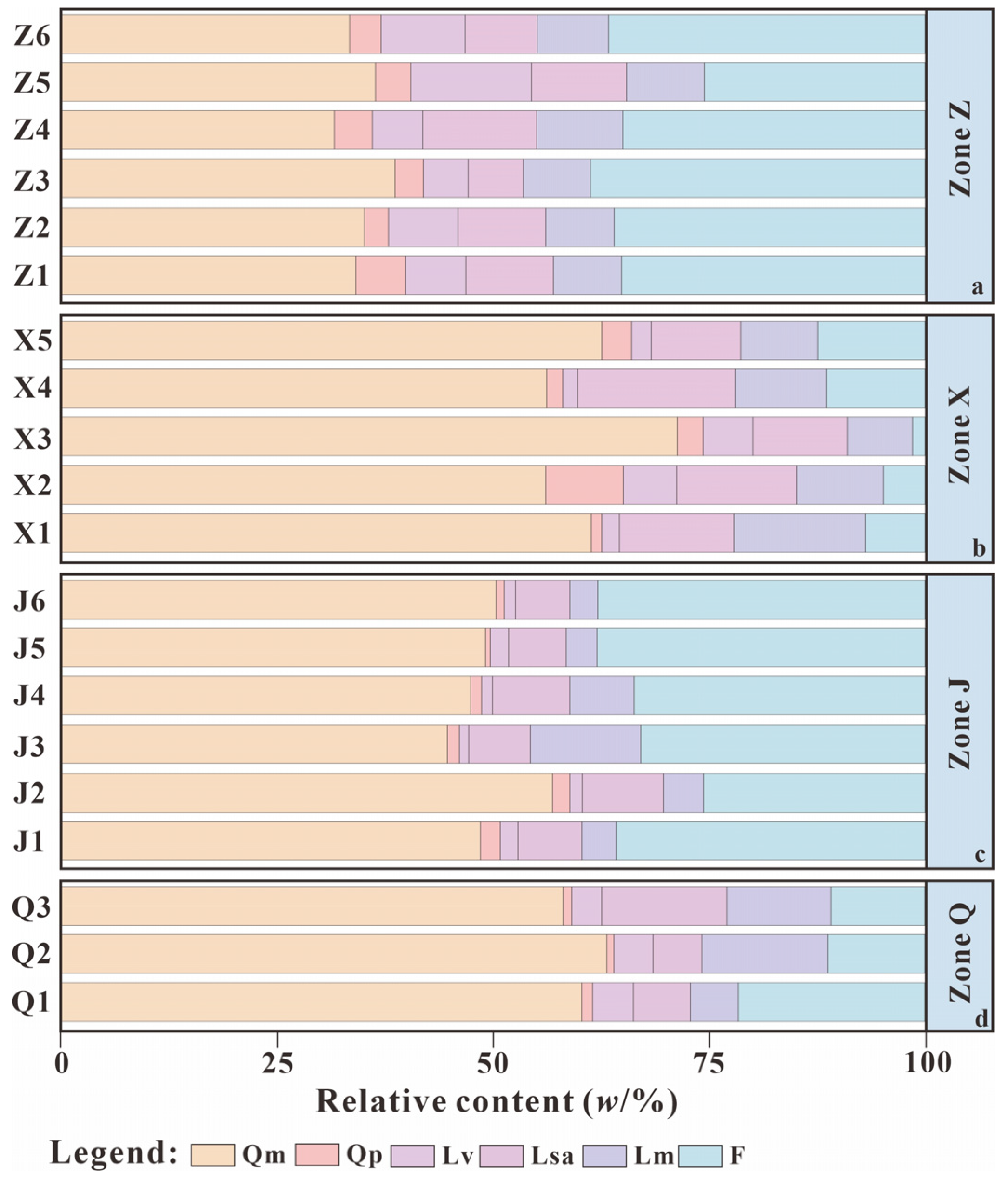 The distribution characteristics of lithic fragment content in Zone Z are significantly different from those in the other three zones, with a relatively low amount of monocrystalline quartz and similar characteristics to the three types of lithic fragment contents, indicating that its provenance may differ from that of Zones X and Q (Figure 5a). The X and Q areas exhibit high amounts of monocrystalline quartz and low amounts of monocrystalline feldspar, suggesting that they may share the same provenance (Figure 5b,d). The distribution of lithic fragment content is largely influenced by the provenance of the LMTB in the west. The amount of monocrystalline quartz in Zone J is slightly lower than that in Zones X and Q, while the amount of monocrystalline feldspar is comparable to that in Zone Z, suggesting that it may be influenced not only by the provenance of Zones X and Q but also by that of Zone Z (Figure 5c).