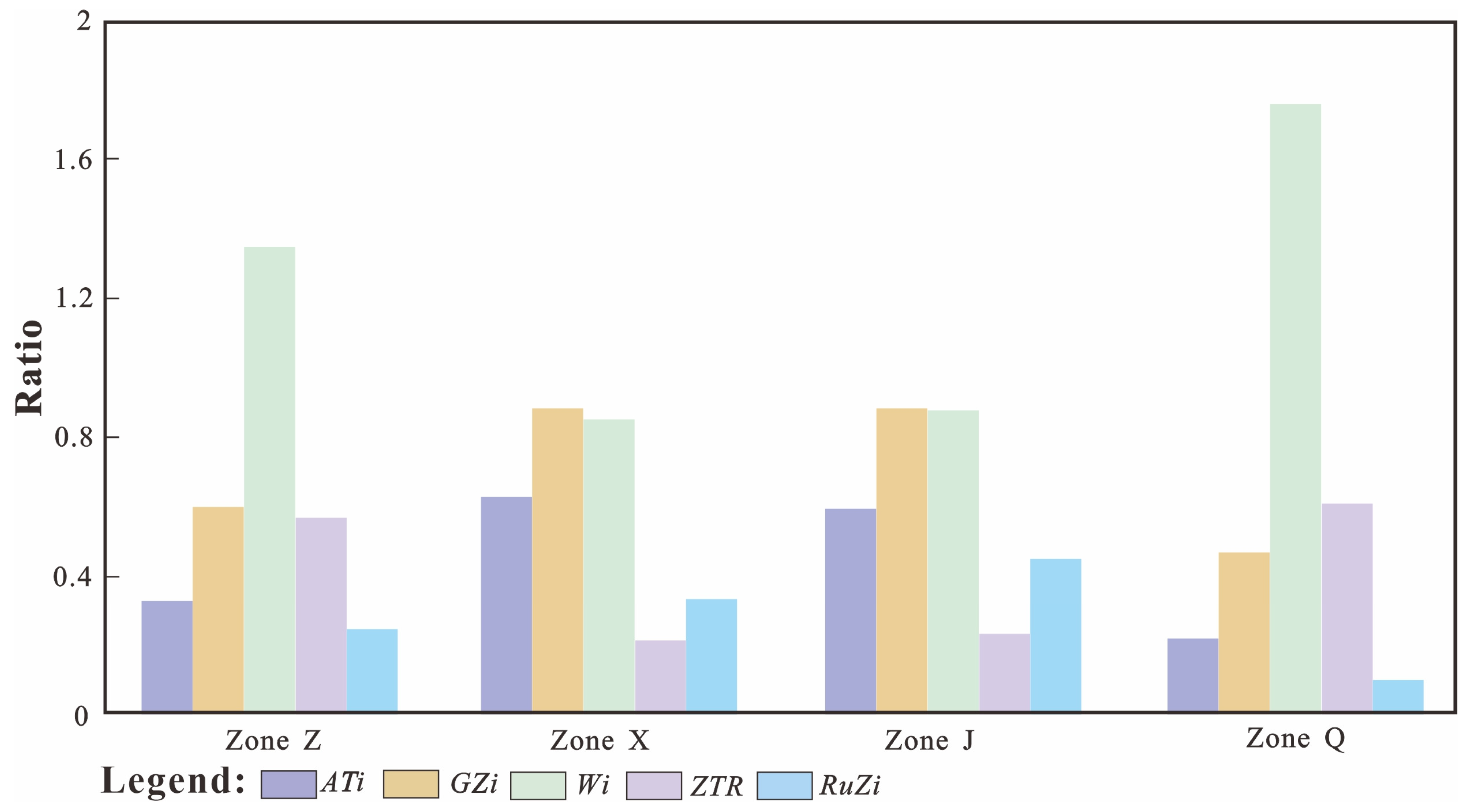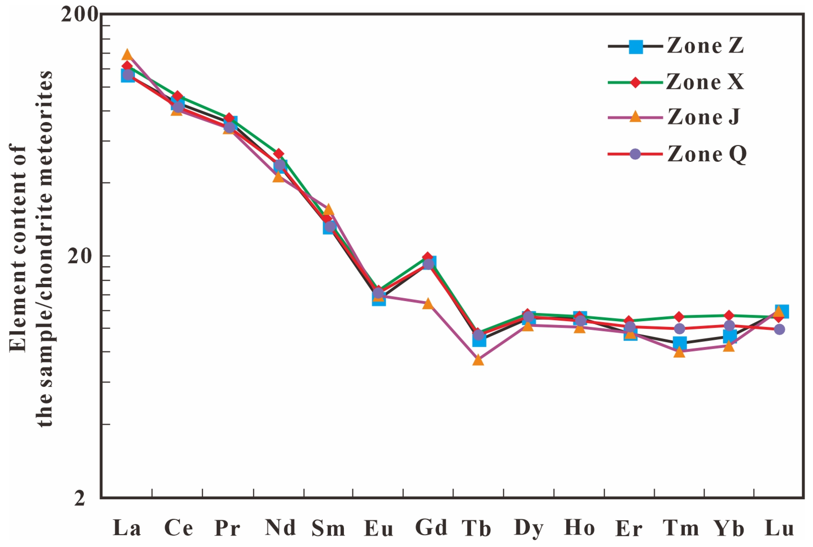 All four regions have enrichment characteristics of light rare-earth elements, and the differentiation of heavy rare-earth elements in the four regions is more obvious. The distribution curves of rare-earth elements in the X and J regions have similar characteristics. In comparison, the heavy rare-earth element curves in the Z and J regions first decrease and then increase at the positions of Er, Tm, Yb, and Lu, with the overall end of the curves showing a boat shape. The J region also showed significant negative differentiation characteristics in the three heavy rare-earth elements Gd, Tb, and Dy (Figure 9).