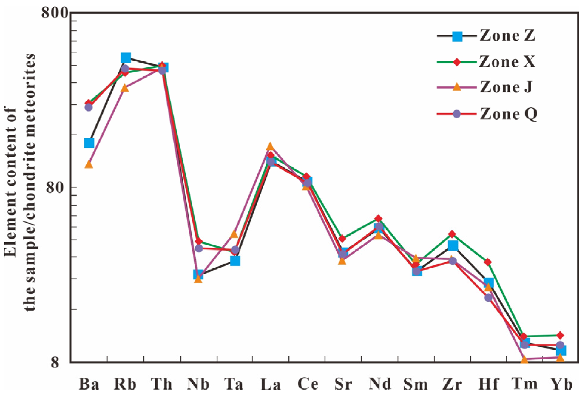 The average La/Th values of the tight sandstone samples in the Shaximiao Formation of Zone Z are relatively small, while the average Zr/Hf values are relatively large. The average values of La/Yb in region X are relatively small, while the average values of Zr/Th and Sc/Cr are relatively large. The average values of La/Sc in the Q region are relatively small, while the average values of Co/Th and Rb/Sr are relatively large. The average ratio of rare-earth elements to trace elements in region J is either the highest or the lowest. The distribution characteristics of trace elements Th and Hf in the Z region differ significantly from those in the X and Q regions. The distribution characteristics of rare-earth elements and trace elements in the J region are not only similar to those in the Z region but also to those in the X and Q regions.